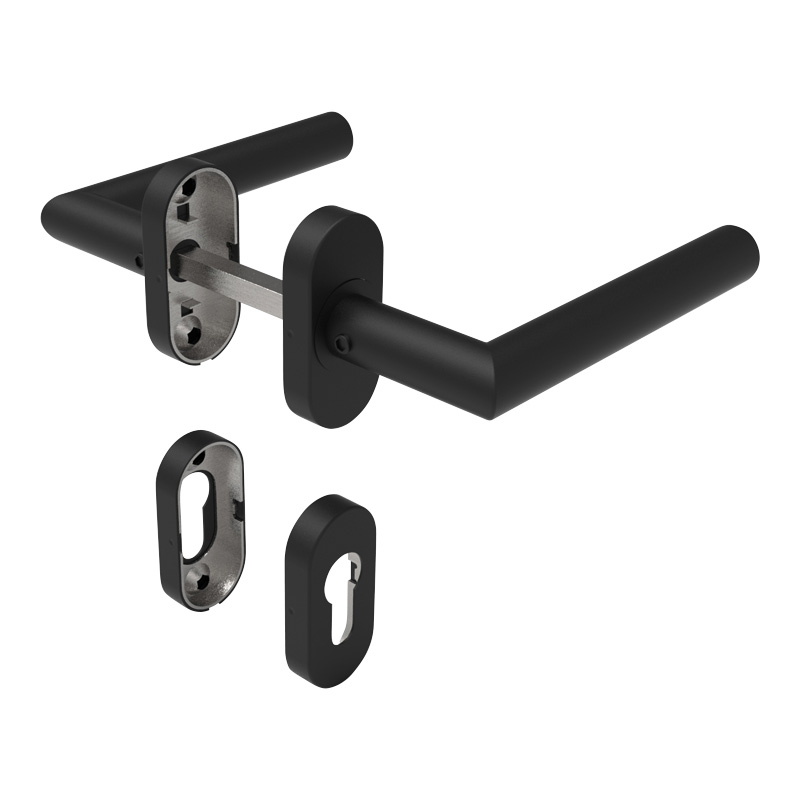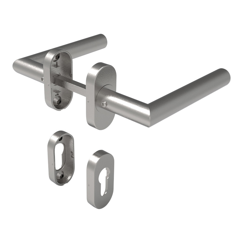 Béquille double sur rosaces ovales clé i, pour montage sur le profil 66 de la porte battante.