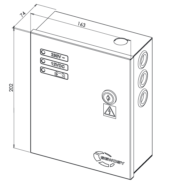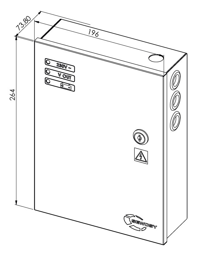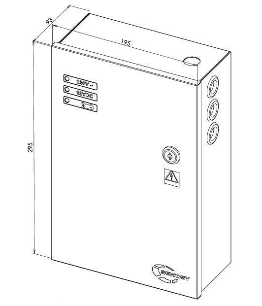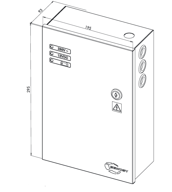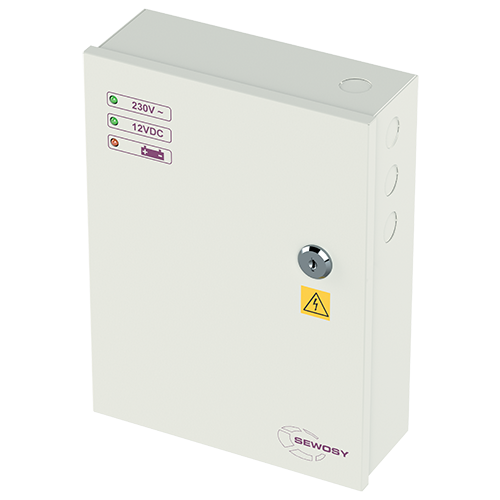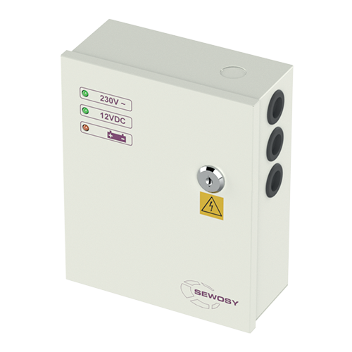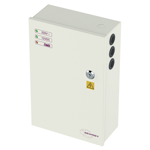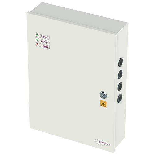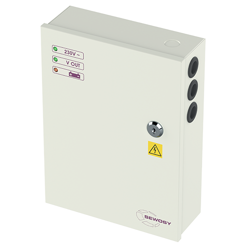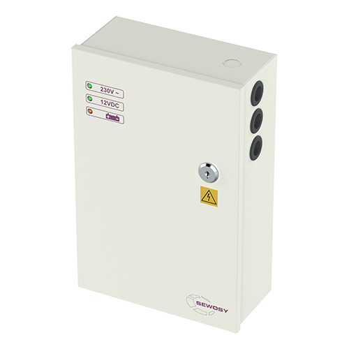 Alimentation bi-tension en coffret métallique sécurisé par un verrouillage à clé.