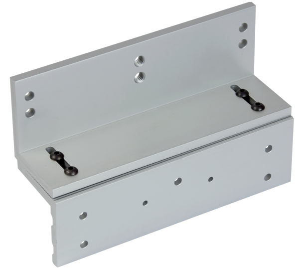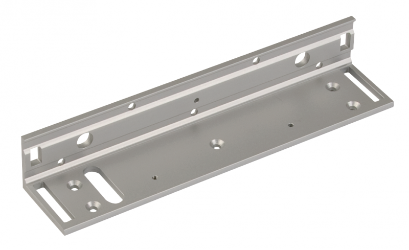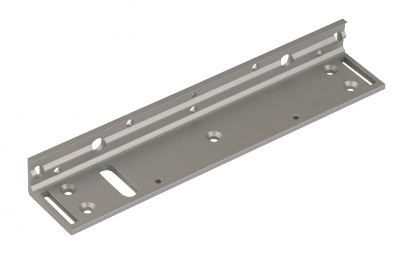 Le montage en applique d’une ventouse électromagnétique de la série EF55O est optimisé avec cette équerre en L ajustable sur des portes poussantes.