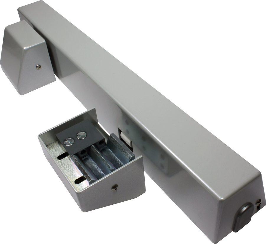 Verrou motorisé à pênes rétractables, 2 états à sécurité positive, monté en haut de porte sans empiètement dans l’unité de passage.