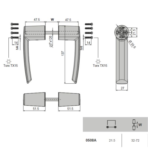 Poignée minimale NUX en version double.Poignée composée uniquement du manche avec le mécanisme entièrement contenu à l'intérieur.Entraxe 21,5 mm - pour profilés de dimension de 32 à 72 mm.Possibilité de montage avec des vis autotaraudeuses pour une fixation directe sur le profil et indépendante du mécanisme choisi.L'orientation des vis autotaraudeuses peut être modifiée de 45°.Le pivot de connex [...]
