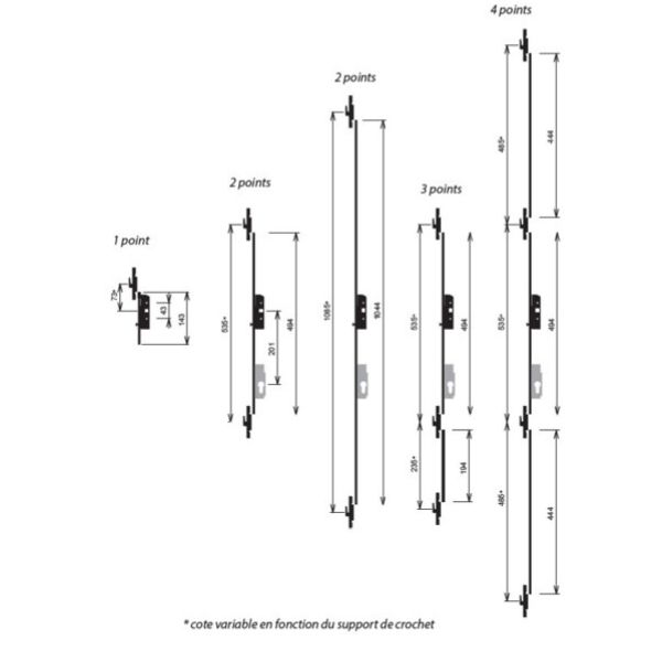 2 rallonges 444 sont préconisées avec la crémone modulaire 494 pour montage en fermeture 4 points.