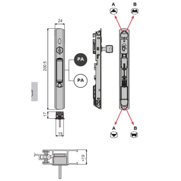 Cuvette pour coulissants. Boîtier en aluminium extrudé, poignée et extremité de verrouillage en polyamide et guide porte-verrou en zamak galvanisé. La vis de fixation et celle de réglage sont pré-assemblées et en acier inox. La poignée est compatible avec n'importe quelle forme et dimension d'usinage sur les profils, l'accouplement et la fixation sont simples et rapides grâce au système de fixation innovant qui évite tout vis en vue. Equipée de dispositif anti-effraction. Compatible avec dispositif anti-fausse manoeuvre (art. 5020A et 5020B). S'applique aux portes avec des poignées de tirage monté sur le côté extérieur.Equipée de verrouillage avec cylindre de sécurité actionné par une clé.