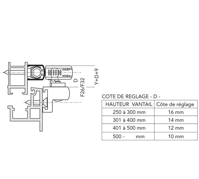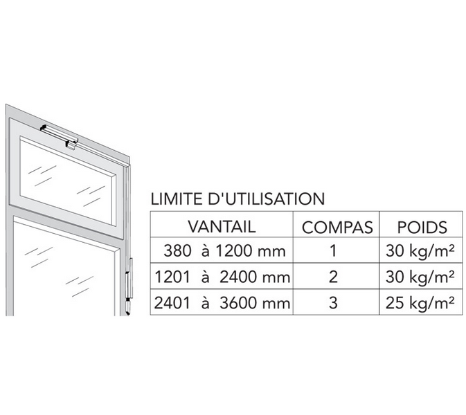 Ferme imposte à tringle rigideOL 90 : ouverture 170 mmOL 95 : ouverture 220 mmCapot aluminiumTringle acier diam 8Poids du vantail maxi 80 KgLargeur du vantail de 380 à 3600 mm.