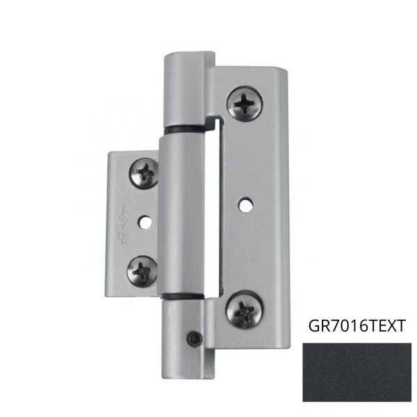 Corps de paumelle en aluminium extrudé anodisé ou laqué. Axe de rotation en acier inox. Douilles de rotation en nylon autolubrifié. Vis et plaques de fixation en acier inox, pré-montées. Predisposition pour la goupille de sûreté pour éviter le glissement vertical. Aspect externe identique à les paumelles de Oscillo-Battant GALIPLUS