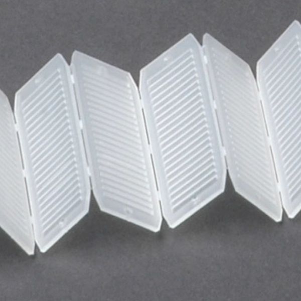 DESCRIPTION : Gamme de cales de pose en réglettes de 10 cales , réalisé en POLYPROPYLÈNE translucide , pliage en accordéon fait l’effet de ressort , cales reliées par une charnière prédécoupé , épaisseur variable de 10 x 1,3 mm
