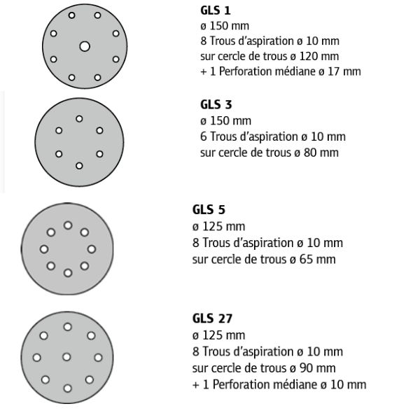 Pour le ponçage avec machines portatives orbitales:Perforation type GLS-1 (8 trous diam 10 sur cercle 120mm + 1 central)Perforation type GLS-3 (6 trous diam 10 sur cercle 80mm)Perforation type GLS-5 (8 trous diam 10 sur cercle 65mm)Perforation type GLS-27 (8 Trous diam 10 mm sur cercle 90mm + 1 centr [...]