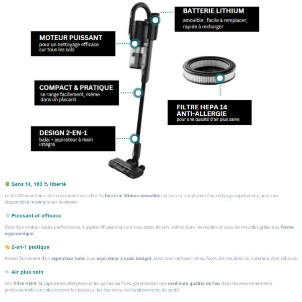 ASPIRATEUR BALAI SANS FIL VU200 +1 BATTERIE + 1 CHARGEUR