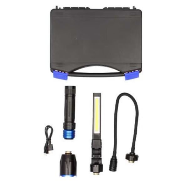 La tête principale est une lampe torche offrant une portée de 90m et un éclairage puissant.Elle peut être remplacée par une autre tête permettant d'utiliser le produit en lampe d'inspection.Le dernier accessoire de ce kit est une lampe d'inspection sur un long raccord flexible permettant d'aller éclairer des endroits [...]