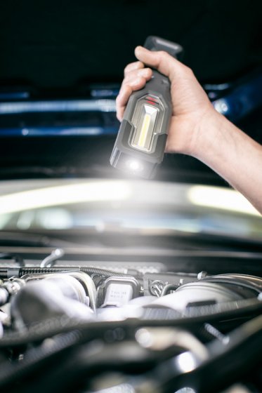 Socle de maintien aimanté orientable +/-60°, 2 aimants intégrés et crochet rabattable pivotantrechargeable par le micro port USB grâce au câble de raccordement USB fournifonction variation de l'intensité lumineuse en continu de 10% à 100%indice de protection : IP54fonctionnement : batterie 3,7V 4,4Ahampoule LEDintensité lumineuse : 1000 lm (en façade) + 100 lm (en frontal).