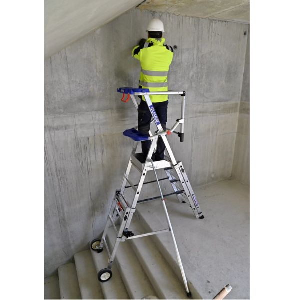 Platesforme Individuelles Roulantes (P.I.R) sont utilisées pour travailler en hauteur et en sécurité avec un seul opérateur sur le plancher.Deux roues sont prévues pour le déplacement de la P.I.R, et ne sont pas orientables.Deux stabilisateurs indépendants sont télescopiques, le verrouillage est automatique et la stabilité du produit répond au critère de la norme.Charge utile : 150 kgPoids : 28 kgDimensions plancher : 0,40 x 0 [...]