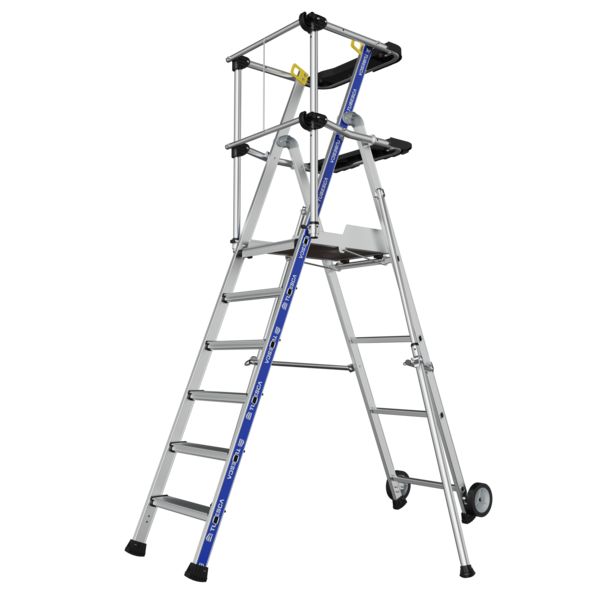 Garde-corps rigide 4 côtés avec lisses de protection antichute arrière à fermeture semi-automatiquemarches antidérapantes 80 mmporte-outils compartimenté amovible, résistance 25 kg, avec crochets intégrés (maxi 10 kg)tablette XL résistance 25 kgstabilisateurs rétractables à réglage millimétriqueplancher grand confort 600 x 400 mm antidérapant en bois éco-sourcéespace de travail ergonomique et confortableroues de déplacement tout-terrain Ø175 mm.