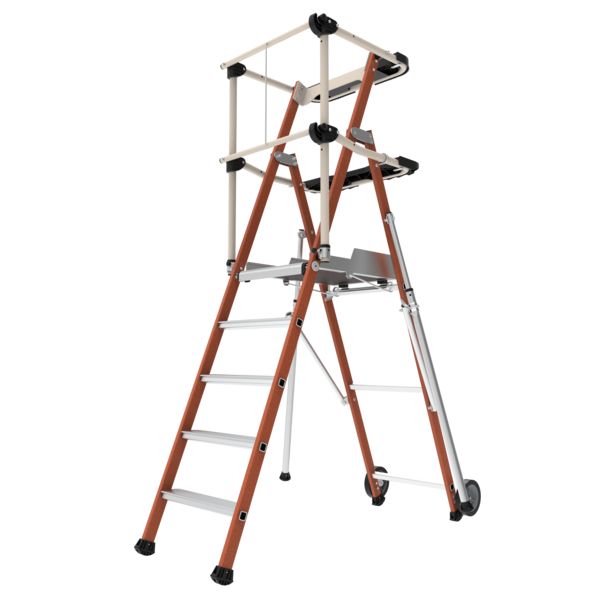 Fibre de verre en montants pour travailler en étant protégé des chocs électriquesgarde-corps rigide 4 côtés avec lisses et protection rilsanisée isolantemarches antidérapantes 80 mmporte-outils compartimenté amovible, résistance 25 kg, avec crochets intégrés (10kg)tablette XL résistance 25 kgplancher grand confort 600 x 400 mm antidérapant en bois éco-sourcé avec verrou automatiquecrochet anti-soulèvement du plancherespace de travail ergonomique et confortablestabilisateurs rétractables [...]