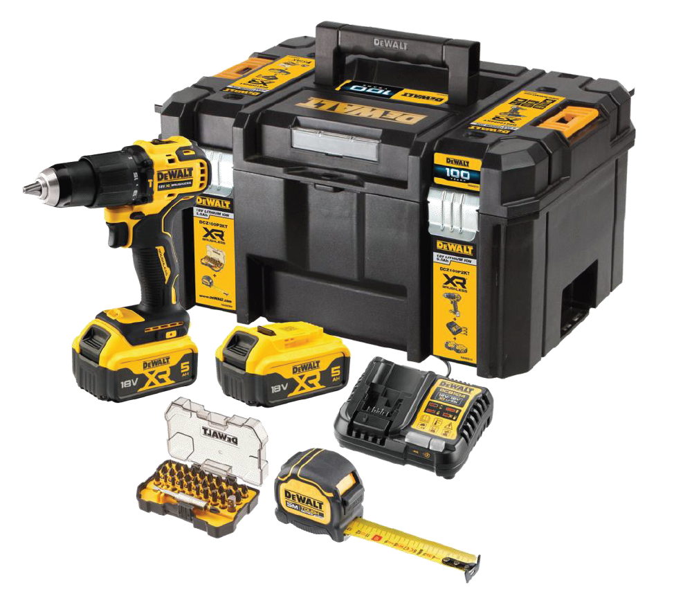 Perceuse à percussion XR 18V Légère et compacte Mandrin métal 13 mm Couple 65 Nm Poids (sans batterie) 1,2 kg Coffret semi-profond TSTAK 2 batterie XR 18V 5Ah + Chargeur