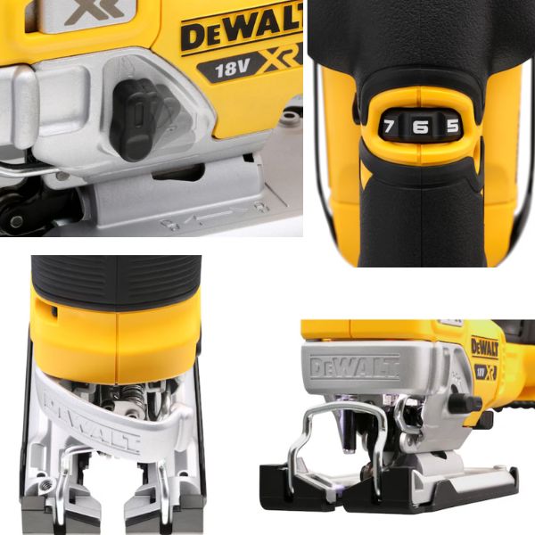 Déclenchement à vitesse variable intelligente et interrupteur lock-offMouvement pendulaire à 4 étagesSemelle anti-rayures réglable sans outil, inclinable jusqu‘à 45° de chaque côtéMécanisme de changement rapide de lame sans clé acceptant les lames à emmanchement en T