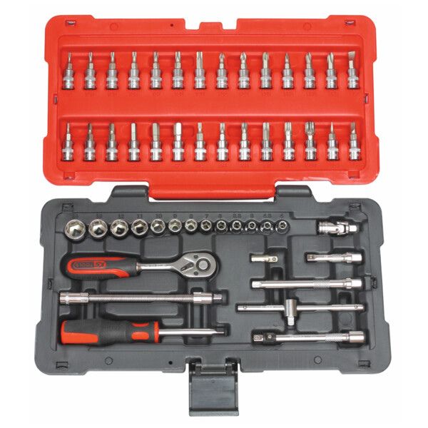 Coffret bi matière avec coins renforcés, finition chromée satinéecomposition :douilles F6 : 13 de 4 à 14 mm- embouts douille tournevisFente : 4 - 5.5 - 7 mmPhilips : PH1, PH2, PH3Pozidriv : PZ1, PZ2, PZ3- embouts douilleF6 : 3 - 4 - 5 - 6 - 7 - 8 mmTorx : T10 - T15 - T20 - T25 - T27 - T 30 - T40M4 - M5 - M6 - M7 - M8 - M10- cardan 1/4"- rallonges : 50 - 100 mm + 150 mm- rallonge verrouillée 100 mm- poignée coulissante 110 mm- cardan- poignée emmanchée- cliquet 1/4" - 145 mmdimensions : H.67 x L.3 [...]