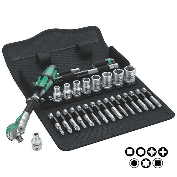 Composition :1 cliquet Zyklop Speed à emmanchement 1/4" (8000 A)9 douilles Zyklop1 rallonge Zyklop (longue) avec bague de rotation rapide1 rallonge "Wobble"1 adaptateur à changement rapide15 embouts :- 8004 A : 1/4 x 152 mm- 8790 HMA : 5 - 5,5 - 6 - 7 - 8 - 10 - 11- 12 - 13 x 23mm- 8794 A : 1/4 x 56 mm- 8784 A1 : 1/4 x 37 mm- 851/4 Z PH 1 - 2 - 3 x 50 mm- 855/4 Z PZ 1 - 2 x 50 mm- 867/4 Z Torx 10-15-20-25-27-30 x 50 mm- 840/4 Z Hex-Plus: 3 - 4 - 5 - 6 x 50 mm. [...]