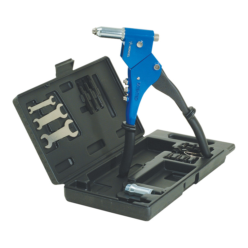 Pince à main pour la pose de rivets aveugles diamètre 2,4 à 5 mm et d'écrous à sertir en aveugle M4 à M6 et de goujons à sertir en aveugle M4 à M6. Modèle robuste en acier laqué - tête orientable à 360°. Dans coffret en plastique antichoc: 4 nez de pose pour rivets aveugles.
