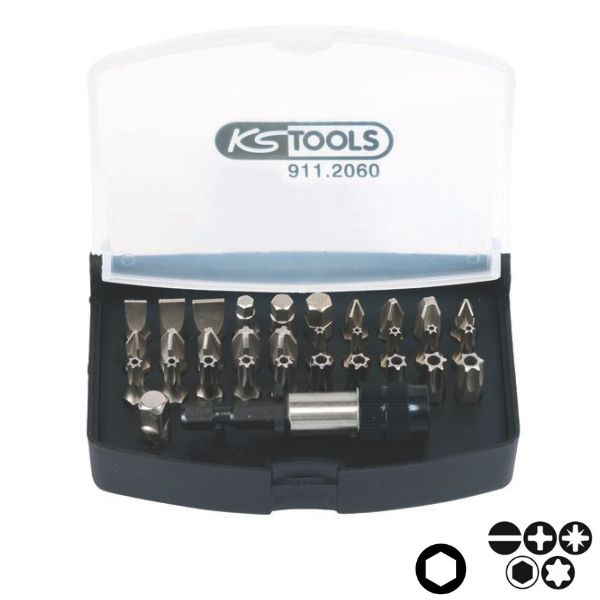 Entraînement 6 pans selon DIN 3126 / ISO 1173 - C 6,3 pour une utilisation manuelle ou avec visseuse adaptateur 1/4, porte-embouts magnétique à verrouillage rapide fournis acier nickelé composition : - adaptateur 1/4'' - embout porte-douilles 1/4'' - 3 embouts PH : PH1 - PH2 - PH3 - 6 embouts PZ : 2 x PZ1 - 2 x PZ2 - 2 x PZ3 - 3 embouts Fente : 5,5 - 6,5 - 8 mm - 3 embouts hexagonaux : 4 - 5 - 6 mm - 15 embouts Torx : 2 x T10 - 3 x T15 - 2 x T20 - 3 x T25 - 3 x T30 - 2 x T40.