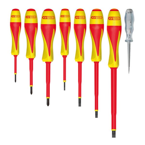 composé de 4 tournevis fente, 3 tournevis Phillips et 1 tournevis testeur 150 - 250 V