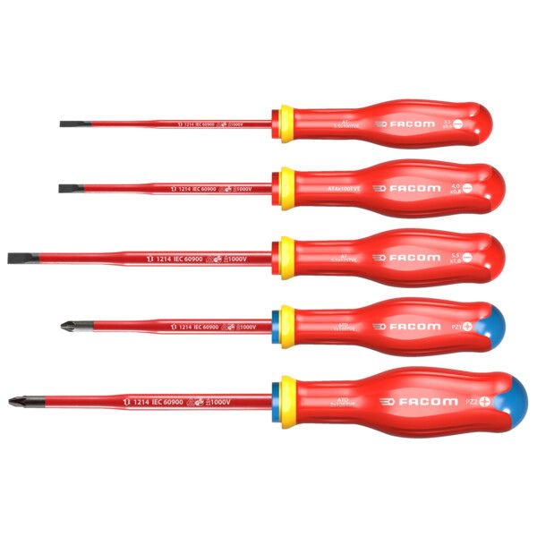 Lames de 27 % plus minces que les tournevis standard Facom résistance aux solvants et aux produits chimiques poignée souple confortable code couleur et marquage de la taille de la panne et du type de tournevis isolés jusqu'à 1 000 V composition : - 3 tournevis Fente : 6,5 - 4,0 - 5,5 - 2 tournevis Pozidriv : PZ1 - PZ2.