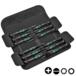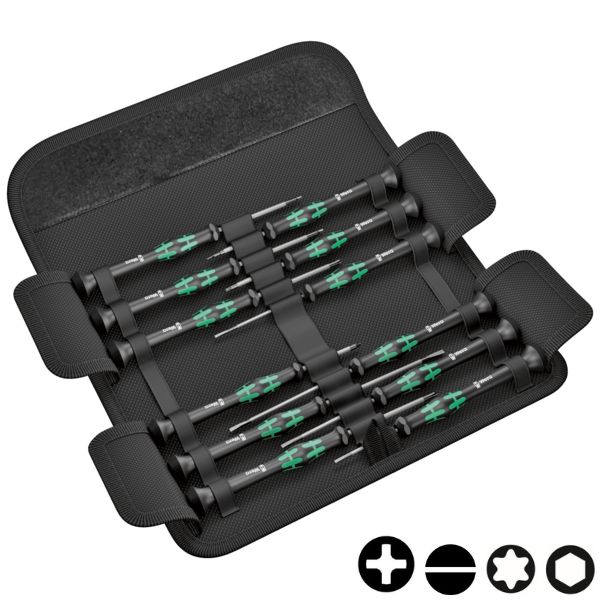Jeu de 12 pièces sous pochette pliante fixable à la ceinture - 2050 PH Micro : PH 00x60; PH 0x60 - 2067 TORX® HF : TX 5x40; TX 6x40 - 2035 Micro : 0,23x1,5x40; 0,30x1,8x60; 0,40x2,0x60; 0,40x2,5x80; 0,50x3,0x80 - 2054 Micro : 0,9x40; 1,5x60; 2x60 "take it easy" : profil et taille facilement repérables.