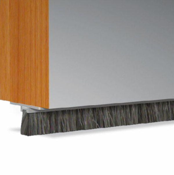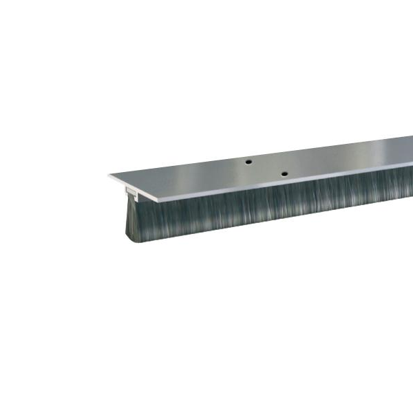 Bas de porte en aluminium. Il se compose d'un support en aluminium naturel et d'une brosse souple en polypropylène imperméable. Ce profilé se pose en applique sous les portes et les coulissants.