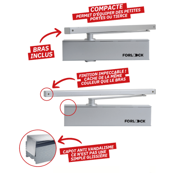 Ferme-porte force fixe 3 (pour porte jusque 950 mm)Pose 4 sens (corps sur porte/linteau x côté paumelles et opposé paumelles)Capot anti vandalismeRéglage à-coup final- Vitesse de fermeture - Frein à l'ouverture fixeBras court idéal utilisation avec sélecteur d'ouverture et porte tierce battante