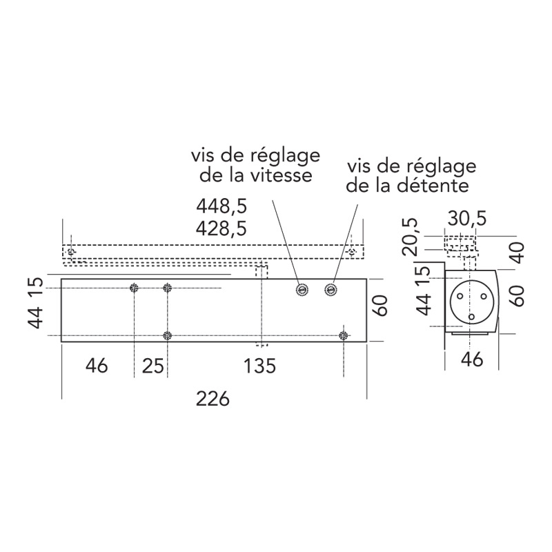 A-coup final et vitesse de fermeture réglable par vis frontale