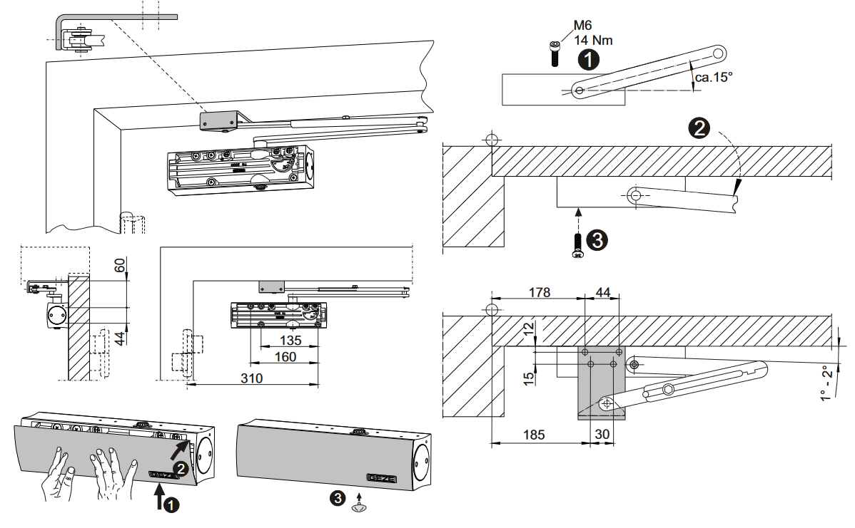 Ferme-porte en applique avec bras à compas pour les portes à un vantail jusqu’à une largeur de vantail de 1100mmForce de fermeture à réglage variable EN2-4Pour portes ouvrant à droite et à gauche sans besoin de modificationAmortissement d'ouverture intégré, freine les portes fermées brusquementÀ-coup final hydraulique, qui accélère la porte juste avant la position ferméeLa vitesse de fermeture pe [...]