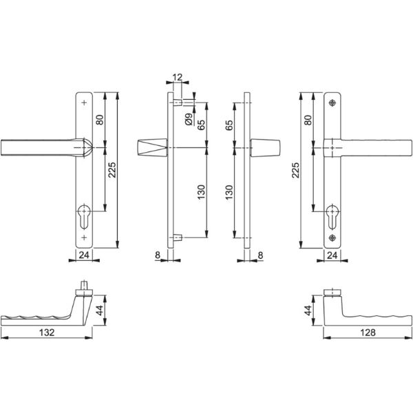 Les béquilles extérieures sont, selon les modèles, avec une saillie de 25 mm ou, normales, avec une saillie de 52 mm. Les béquilles intérieures sont à saillie de 52 mm.