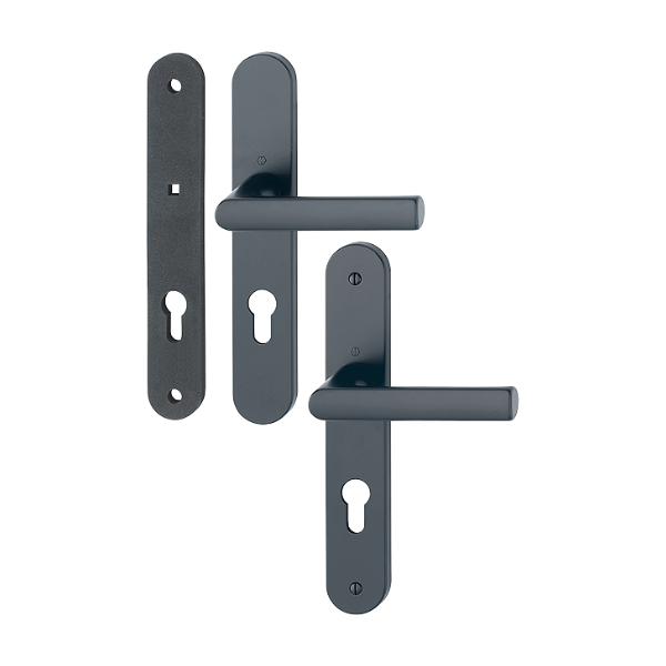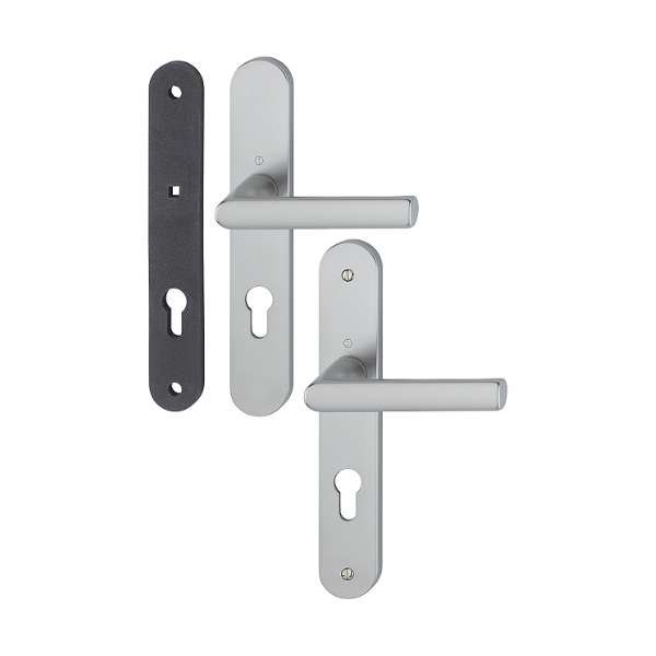 Garniture HOPPE en aluminium sur plaques longues, pour porte d’entrée.
