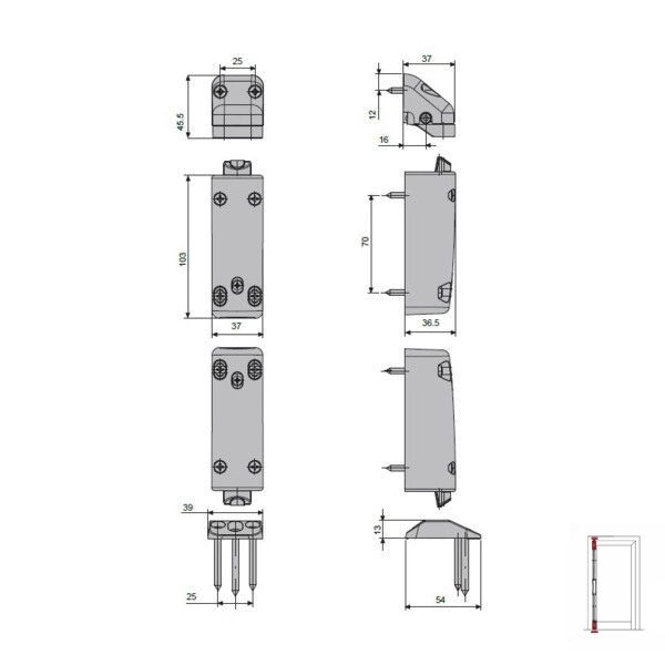 Gâche supérieure en zamak et gâche de sol en acier inox.