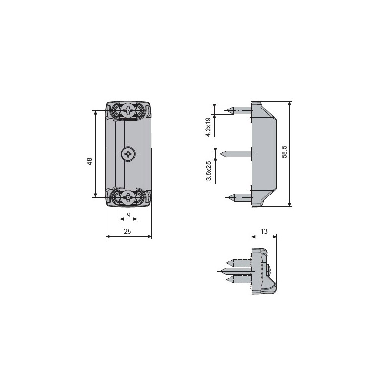 Gâche en zamac pour serrures centrales et pênes haut-bas (à exclusion de l'art. 8401I), utilisable sur portes à deux vantaux. Réglable en horizontal et applicable sur les profils coplanaires et sur ceux avec recouvrement jusqu’ à 10mm, sans l’aide de cales supplémentaires