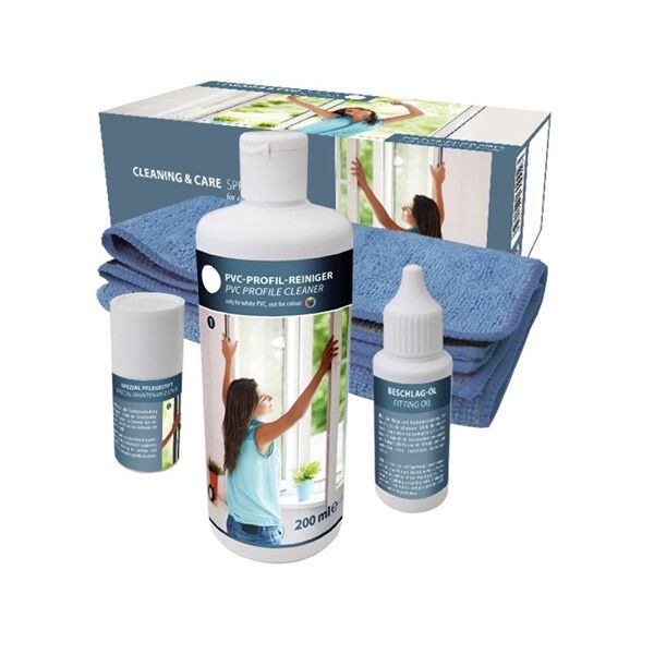 • 1 nettoyant pour profilé 200ml• 1 huile pour ferrure 30ml• 1 stick d’entretien pour les joints• 1 chiffon microfibre