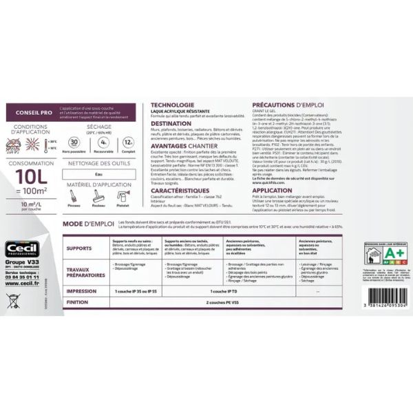 Adhérence renforcée sur tous supports: plâtre, béton, ciment, brique, bois, radiateurtrès bon pouvoir couvrant et garnissantsans trace de reprise: adaptée pour les grandes surfaces et les plafondshaute lessivabilité et forte résistance au lustragel'application d'une sous-couche et l'utilisation de matériel de qualité améliorent l'aspect final et le rendementrendement : 10m²/L par coucheséchage : Hors poussière : 30 min / Recouvrable : 6h / Complet : 24h Dangereux respecter les précautions d [...]
