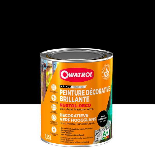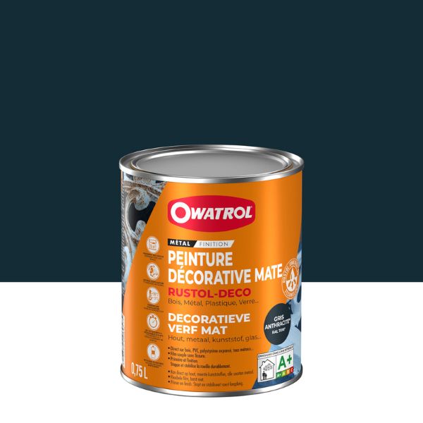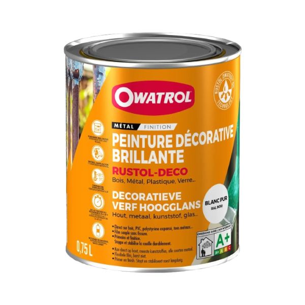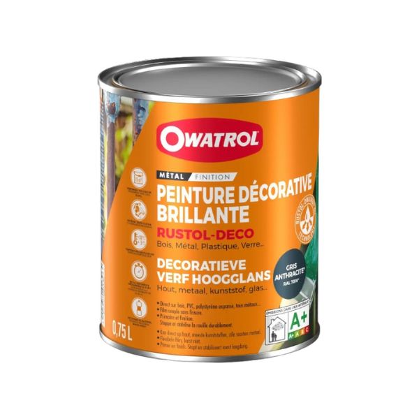 RUSTOL-DÉCO est une peinture antirouille qui assure une protection antirouille renforcée et décorative sur tous supports. Sa formule ultra-performante est très résistante aux agressions extérieures (forte chaleur, intempéries, humidité) et adhère très bien sur des supports différents (bois, métal, mobilier de jardin).. Il permet un résultat de qualité tout au long de l'année. Film souple, non cassant. Résiste à des températures de + 175°C. Intérieur / Extérieur. Métaux ferreux, non ferreux - galva, alu, zinc - bois, plastiques, polystyrène expansé et même le verre. Grilles, balcons, meubles de jardin, volets, vérandas, structures métalliques diverses,... Portes, huisseries, meubles, radiateurs, tuyauteries, machines,...