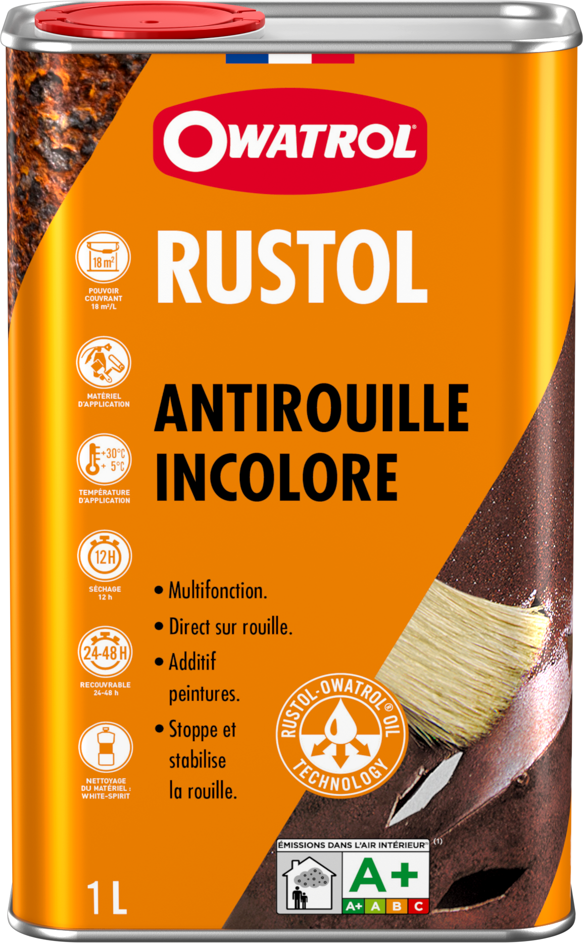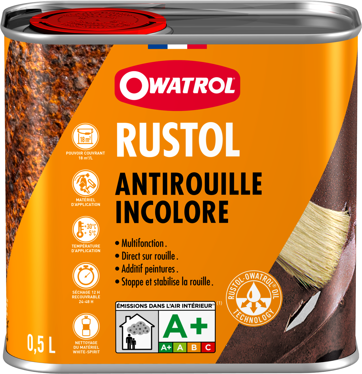 Le RUSTOL - OWATROL® est un traitement antirouille qui permet à vos matériaux d'être plus résistants, stoppe la rouille et les protège des agressions extérieures. A utiliser en sous-couche avant votre peinture de finition, il vous garantit un résultat de qualité et préserve vos matériaux de la chaleur et de l'humidité grâce à son film protecteur.