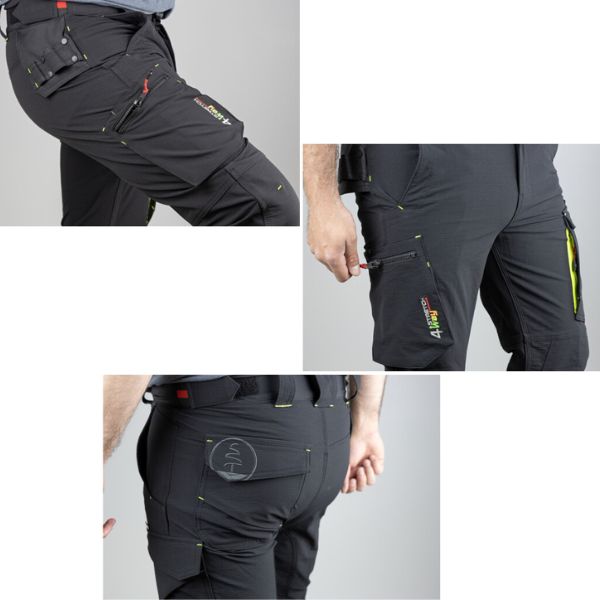 Bouton plastique 4 trous souple Ø 20mm - Braguette zip injecté plastique- Ceinture composée de 5 passants + 1 passant dos large avec réhausselombaire, bande élastiquée anti-glisse resserrable par pattes extensiblesdos - Poches italiennes - Poche cuisse gauche fermée par rabat etscratch - Surpoche fermée par zip - Poche cuisse droite à soufflet, ferméepar zip, avec ouverture poche mètre - Poche dos gauche à soufflet, avecrabat fermé par scratch - Support porte marteau semi volant en Oxford300 [...]