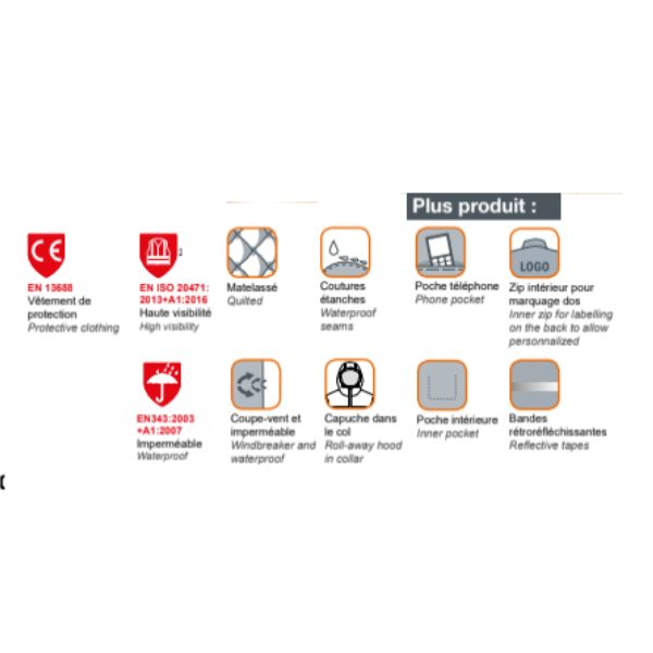 HAUTE VISIBILITE 4 x 1Parka + Blouson + Bodywarmer + Coupe ventEquipement de signalisation haute visibilitécontre les intempéries constitué de 2 vêtements.Avec bandes rétro-réfléchissantes.ParkaPoches intérieures (téléphone poitrine gauche avec rabat + grip et poitrine droite zippée) et extérieures (2 poches basses avec rabat + grip).Capuche fixe enroulée dans le col avec cordon de réglage.Fermeture à [...]