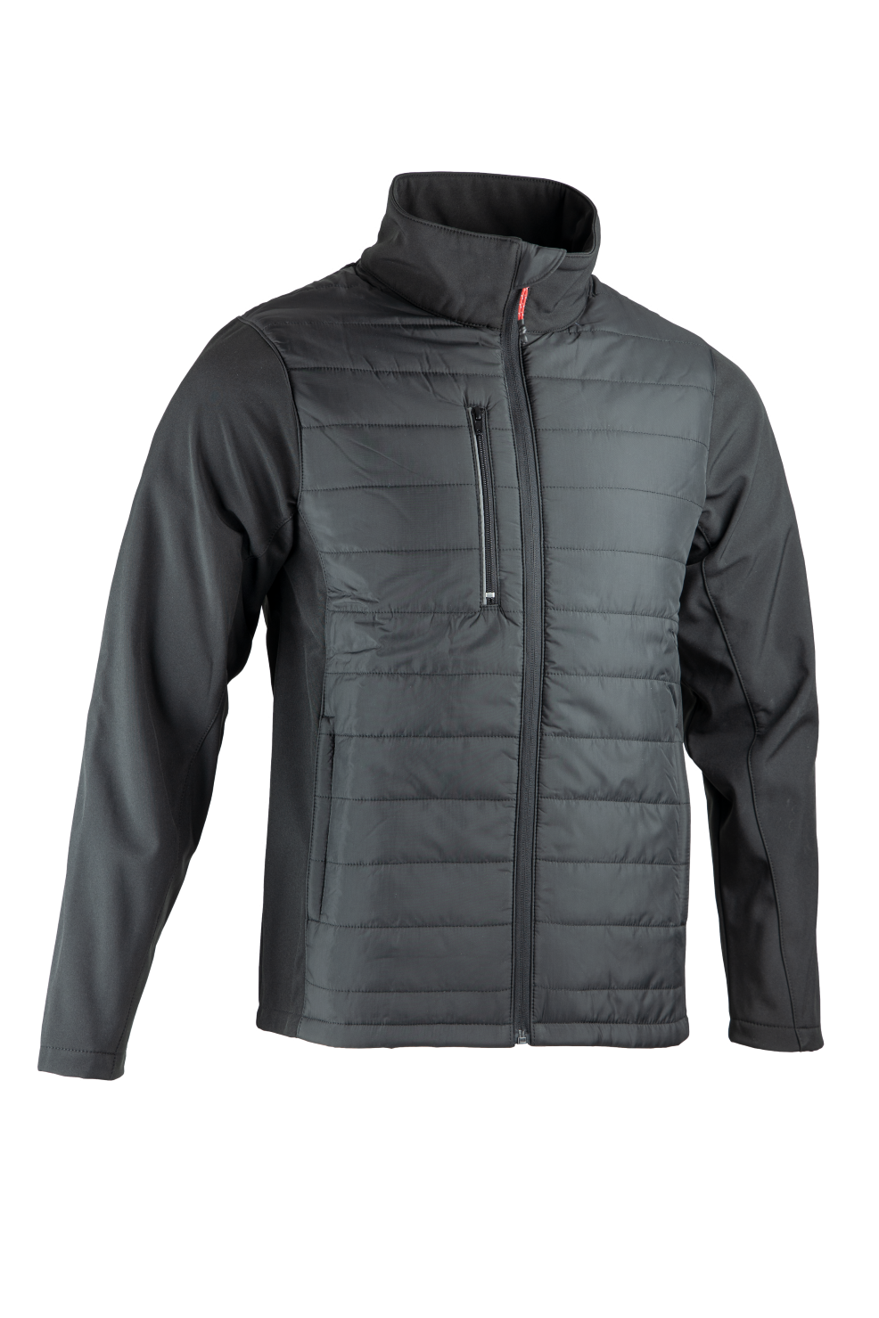 Veste bi-matière, Col montant - manches softshell 2 couches - corps microfibre matelassage rayé - fermé par zip avec patte protège menton - 1 poche poitrine verticale bordée par un passepoil rétro réfléchissant silver - 2 poches basses zippées.