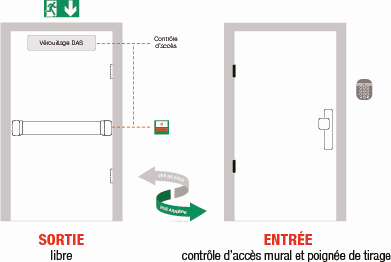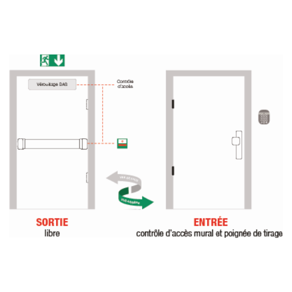 - Commande la libération d’un verrouillage NFS 61-937 (DAS) destiné au contrôle d’entrée mais en sortie toujours libre