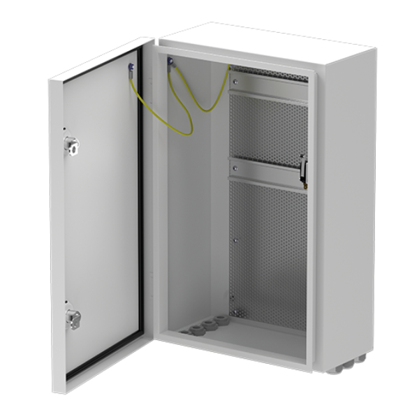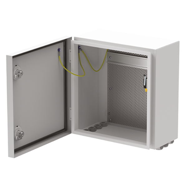 Équipé de la mise à la terre et d’une fonction auto-protection pré-montée, signalant l’ouverture du coffret, la paroi du fond comporte une platine de montage métallique perforée permettant la fixation des cartes électroniques à l’aide des entretoises fournies ainsi que celle du rail DIN amovible inclus.