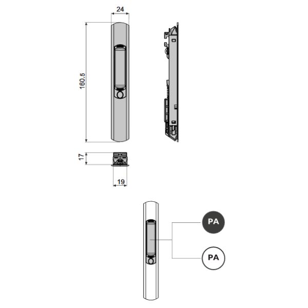 Cuvette pour coulissants. Boîtier en aluminium extrudé, poignée et extremité de verrouillage en polyamide et guide porte-verrou en zamak galvanisé. La vis de fixation et celle de réglage sont pré-assemblées et en acier inox. La poignée est compatible avec n'importe quelle forme et dimension d'usinage sur les profils, l'accouplement et [...]