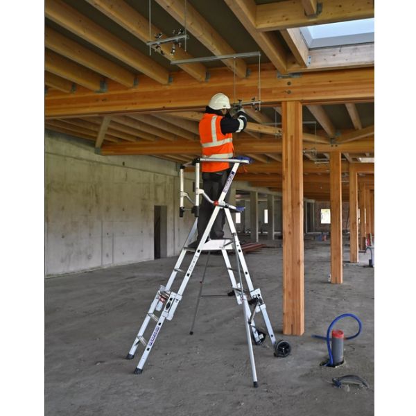 Platesforme Individuelles Roulantes (P.I.R) sont utilisées pour travailler en hauteur et en sécurité avec un seul opérateur sur le plancher.Deux roues sont prévues pour le déplacement de la P.I.R, et ne sont pas orientables.Deux stabilisateurs indépendants sont télescopiques, le verrouillage est automatique et la stabilité du produit répond au critère de la norme.Charge utile : 150 kgPoids : 28 kgDimensions plancher : 0,40 x 0 [...]