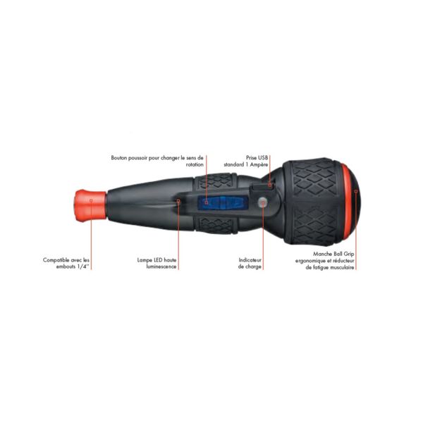 5 fois plus rapide qu’un tournevis manuelJusqu’à 1 000 vissages par charge de batterie.Rechargeable en 60 minutes sur simple prise USB.Lampes LED haute luminescence.Compatible avec les embouts 1/4’’