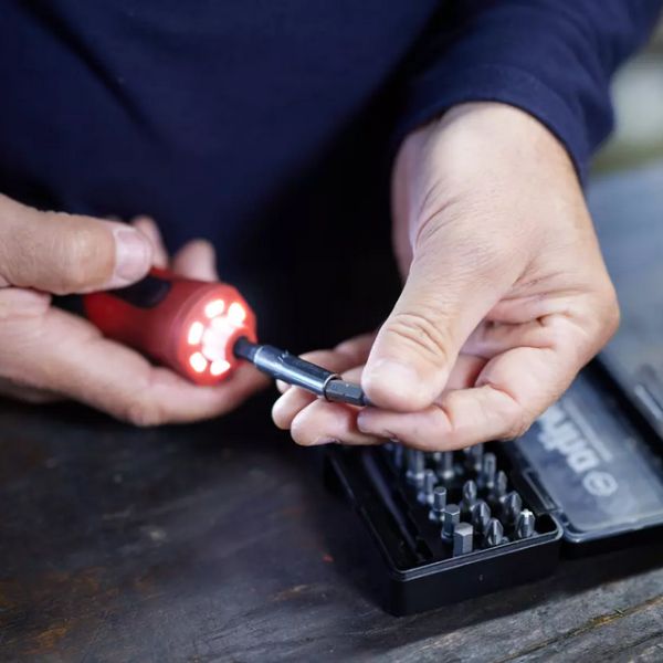 Le tournevis électrique compact se range facilement dans la poche d’un pantalon et peut être transporté sans problème pour une utilisation quotidienne.