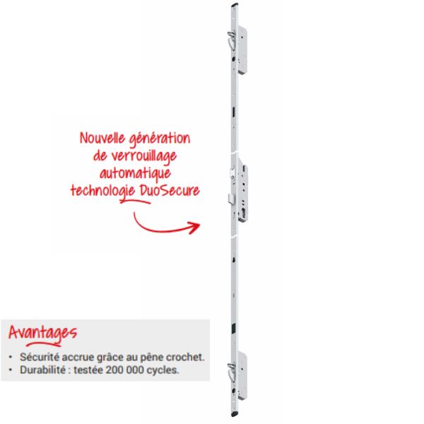 Fonctionnement :A la fermeture de la porte, deux pênes-verrous et deux pênes crochetsse déploient automatiquement.