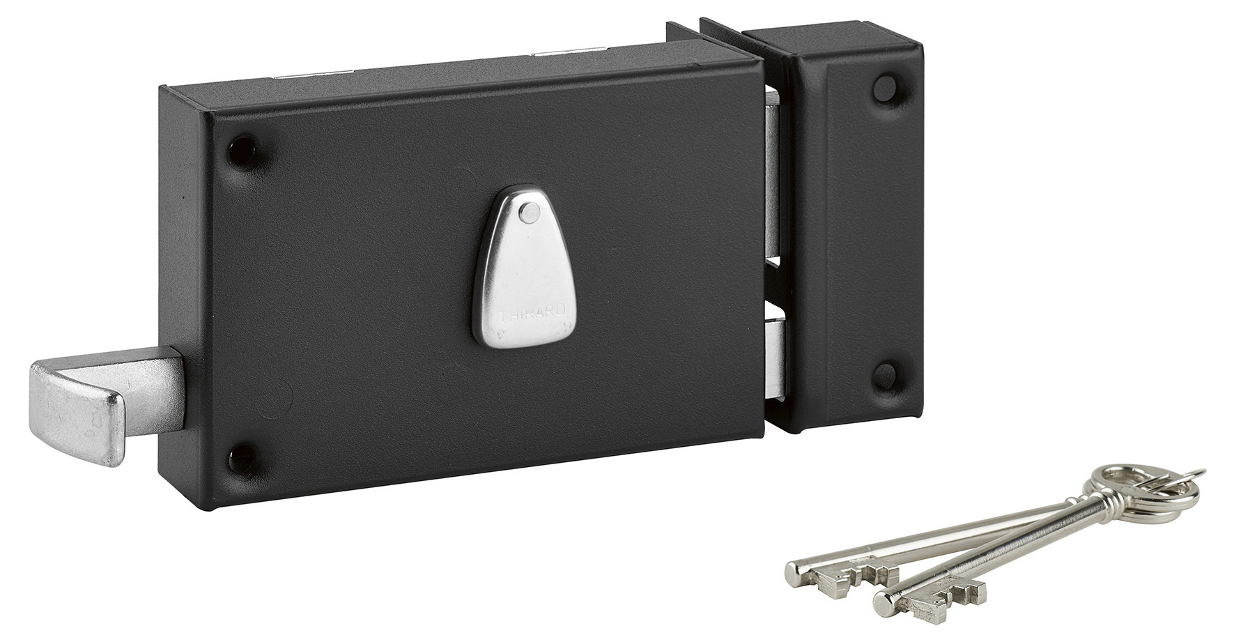 Coffre et gâche acier cambré époxy noir granitépêne et demi-tour aciercanon alliage longueur 45 mmm écanisme à 6 gorges 2 tours avec tirage ou à fouillote ntrée de clé acierà tirage : rappel du demi-tour par la clé livrée avec 2 clés nickelées (20 variures) garantie 10 ans.