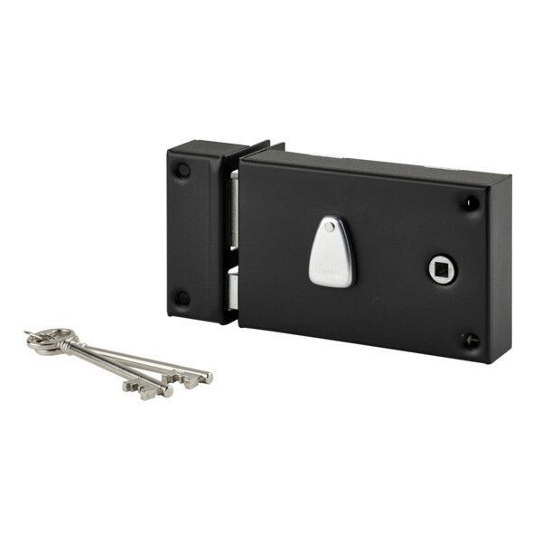 Coffre et gâche acier cambré époxy noir granitépêne et demi-tour acier en saillie de 5 mmcanon alliage longueur 45 mmentrée de clé acier sur coffremécanisme à 6 gorges, 2 tourslivrée avec 2 clés nickelées (20 variures)garantie 10 ans.